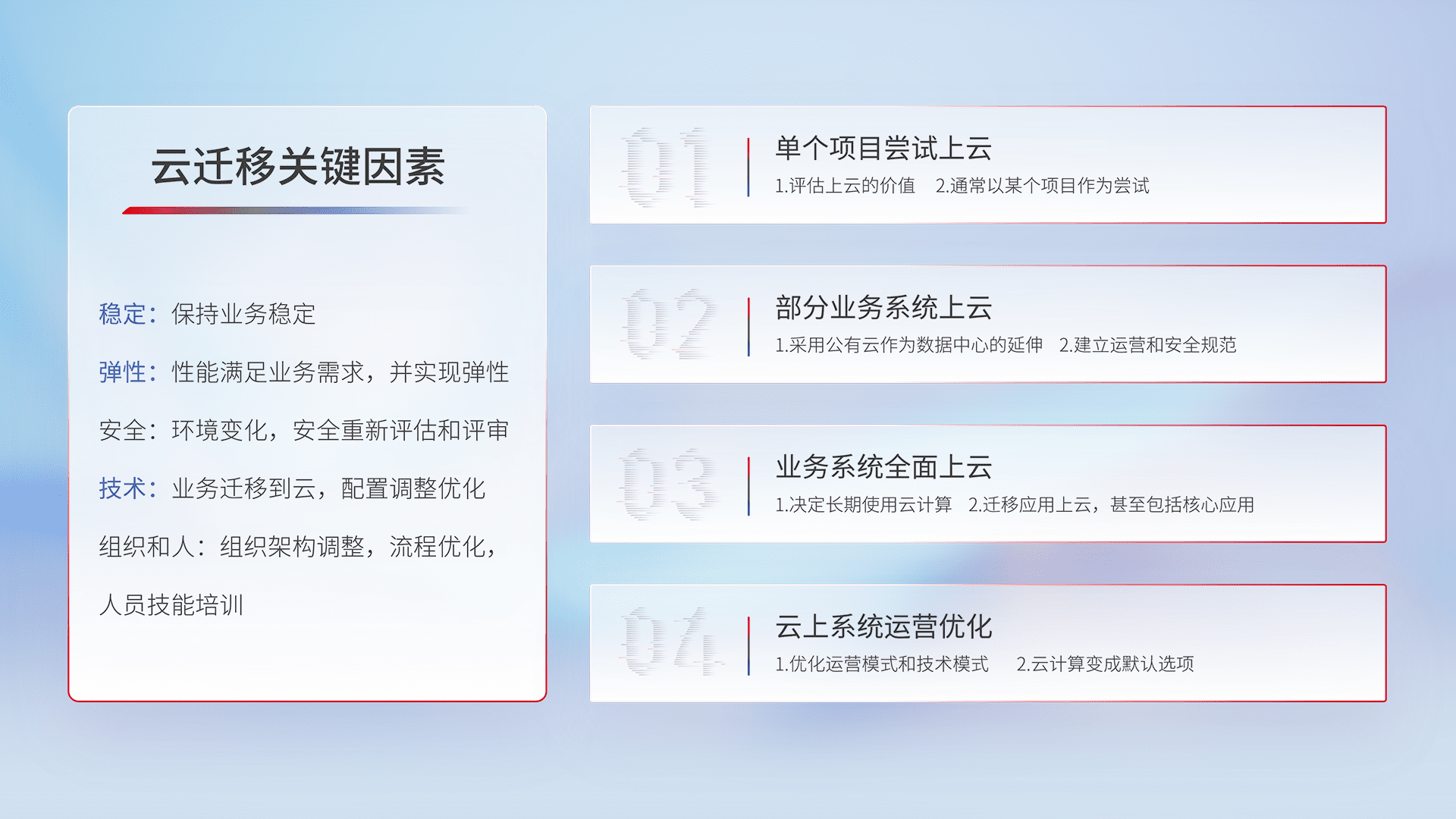 结合实际业务,,,,从规划设计、、云平台选型、、、云原生改造、、数据迁移、、、集成交付,,,迁移全过程为客户识别最佳上云路径,,,做好风险识别管理,,,设计网络架构、、、、身份权限、、、、安全审计合规、、操作审计、、、、日志审计、、、监控告警策略、、、、多站点容灾设计等,,对云上基础设施进行整体规划,,,提升IT治理水平,,,,以满足弹性、、高可用、、高性能的需求。。。。